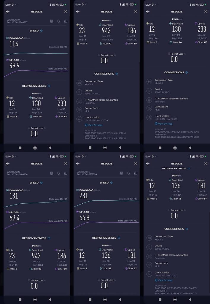 Kecepatan download tercatat antara 178 Mbps hingga 286 Mbps. Sementara upload berada di kisaran 50–65 Mbps. Latensi juga cukup rendah, yaitu sekitar 39–47 ms.